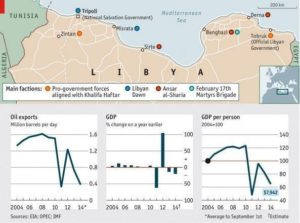 Entre 2012 et 2015, le PIB de la Libye est tombé de 82 000 à 29 000 millions de dollars. En 2008, 3 ans avant l’attaque de l’OTAN, il avait atteint 87 000 millions de dollars. La dette publique a augmenté de 3,7% en 2013 à 100% en 2017. Après que l’OTAN ait déclaré la Libye « libérée » après l’assassinat de Khaddafi en octobre 2011, le pays a été soumis au chaos. Aujourd’hui, c’est une pépinière de brigades islamistes, y compris Daesh, les Gouvernements rivaux et les tribus sont en concurrence pour le pouvoir et les immigrants, sur leur route vers l’Europe, sont vendus ouvertement comme esclaves sur des marchés.