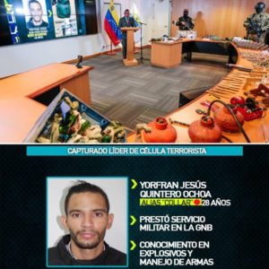 Le ministre du Pouvoir Populaire de l’Intérieur, de la Justice et de la Paix Néstor Reverol, a informé mercredi que cette cellule prévoyait de placer des explosifs aux sièges de certains Pouvoirs Publics et autres institutions de l’Etat comme le Conseil National Electoral, le Commandement Général de la GNB, la Base Aérienne Général Francisco de Miranda à La Carlota, entre autres.
