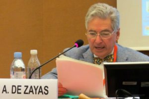 Au sujet du soutien qu’a dû lui apporter le Bureau du Haut Commissaire aux Droits de l’Homme lors de sa visite au Venezuela, De Zayas a souligné : « Ils m’ont puni, je ne connais aucun autre rapporteur qu’on ait envoyé en mission sans aucun assistant ni logistique ni soutien d’aucune sorte. Il n’est pas facile d’être indépendant, il y a un prix à payer. »