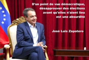 « C’est très sérieux, d’un point de vue démocratique, désapprouver des élections avant qu’elles n’aient lieu est une absurdité, » a affirmé Rodríguez Zapatero lors d’une conférence de presse qu’il a donnée après une réunion avec le Président Nicolás Maduro au Palais de Miraflores, diffusée par Venezolana de Televisión.