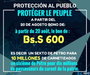 Le Président a aussi annoncé l’attribution d’un bon de reconversion monétaire de 600 bolivars souverains (60 millions de bolívars actuels) grâce au Carnet de la Patrie à partir ce mardi à 10 millions de personnes parmi lesquelles les bénéficiaires de la Mission Logements de la Patrie. Ce sera un « bon d’adaptation. »