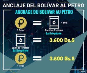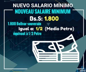 L’augmentation de salaire équivaut à 60 fois le salaire mensuel en vigueur de 3 millions ( 5.196.000 de bolivars y compris le ticket du panier de base). « S’ils dollarisent les prix, je pétrolise le salaire. Je souhaite une restauration de l’économie avec un ancrage du Petro dans le nouveau système salarial vénézuélien, » a déclaré le Chef de l’Etat.