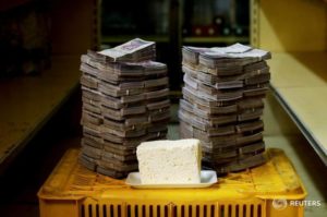 3. L’embargo financier des États-Unis. Le 25 août 2017, afin de « combattre la dictature et de rétablir la démocratie » le président américain Donald Trump a fait un pas de plus dans les mesures de blocage économique, commercial et financier du Venezuela. Le communiqué de la Maison Blanche disait : « La nouvelle mesure du président interdit d’effectuer des transactions avec des titres de la dette et des actions émis par le gouvernement vénézuélien et sa compagnie pétrolière étatique. Il interdit également les transactions avec certains bons existants qui appartiennent au secteur public vénézuélien, ainsi que les paiements de dividendes au gouvernement du Venezuela ». En d’autres termes : encore plus de difficultés pour s’endetter en dollars et plus de difficultés encore pour le Venezuela d’obtenir les dollars dont il a besoin (sur le marché officiel) pour importer les produits qu’il n’a pas, de srte qu’il est forcé de s’en procurer sur le marché noir des devises, plus chers. Les conséquences sont évidentes : une augmentation des pénuries, une plus grande dévaluation du bolivar à l’égard du dollar sur le marché illégal, et une plus grande augmentation des prix.