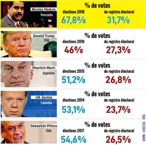 Dehors, c’est autre chose. Il y a plus d’agitation et de spectacle médiatique. Avec un Luis Almagro, comme chef d’une OEA plus que dévaluée (et répudiée) exigeant dans son dernier dernier twitter, d’exhorter « la communauté internationale à ignorer le dictateur Maduro, et à s’abstenir de fournir une aide financière et militaire. Ou le « Club de Presidentes con Prontuario Judicial y Policial » (Club des présidents ayant un casier judiciaire et policier), qui s’appellent eux-mêmes le « Grupo de Lima » (Groupe de Lima), mentant aux quatre vents que « le processus électoral mené au Venezuela le 20 mai 2018 manque de légitimité car il ne comptait ni la participation de tous les acteurs politiques vénézuéliens, ni la présence d’observateurs internationaux indépendants ». Ils déclarent cela en sachant très bien qu’il y a eu des partis et des candidats de l’opposition, qui ont bien sûr été vaincus par des milliers de voix, ainsi qu’un contrôle international multiple et impartial, en plus des représentants bien connus des médias hégémoniques qui ont été chargés d’insulter et d’essayer de dévaluer le processus électoral.