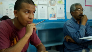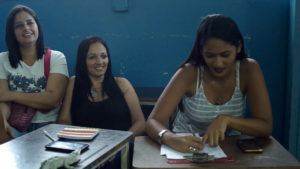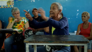 Un homme mince, lunettes à monture noire, se lève : un professeur d’économie de l’université bolivarienne, accompagné d’étudiant(e)s comme Mariana qui a dessiné un plan des fonctions de la banque. « Une banque comunale n’est pas comme une banque privée qui utilise notre argent pour faire des bénéfices sans que nous ne puissions rien contrôler. La banque communale génère des bénéfices pour la communauté. Chaque projet a ses caractéristiques et ses cycles. Semer des pommes de terre ou faire du pain, ce sont des frais différents et des délais de remboursement différents. Les étudiants peuvent vous aider, par exemple donner un cours de comptabilité… »