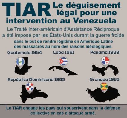 Le Gouvernement de la République Bolivarienne du Venezuela dénonce catégoriquement devant la communauté internationale et les peuples du monde l’infâme décision d’un petit groupe de gouvernements de la région qui, alignés sur les intérêts du Gouvernement suprémaciste des Etats-Unis, ont invoqué l’activation d’un instrument nocif de l’histoire de notre continent : le Traité Inter-américain d’Assistance Réciproque (TIAR).