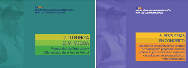Après les trois piliers légaux de notre réforme que sont la Constitution, la Loi de la Police et la Loi du Statut Policier, nous avons développé tout un arsenal de normes et de réglementations. Tout ce qui est contenu dans la loi a été appliqué en manuels, en protocoles d’actions servant pour tous les domaines possibles. Les personnes qui accusent notre police de ne pas être une institution de l’Etat ne savent pas de quoi elles parlent Pour les équipements, nous avons un manuel, pour les procédures, nous avons un manuel. Pour les cérémonies et le protocole, nous avons un manuel. Le policier vénézuélien reçoit une formation de très haut niveau académique pour tous ces règlements. Regarde ce manuel, il est très important [il nous tend un manuel]. Il est intitulé « Usage progressif et différencié de la force ». Ce manuel est central pour les policiers mais aussi pour notre Garde Nationale Boliviarienne, l’équivalent de la gendarmerie française. Et regarde celui-ci [il nous montre un autre manuel] : « contrôle des réunions et manifestations ». Lorsque certains disent que la police vénézuélienne réprime les manifestations de manière violente, et ne respecte pas les standards en matière de droits de l’Homme, c’est faux.