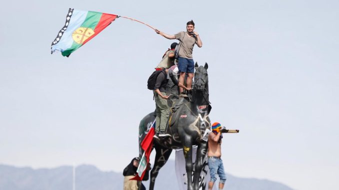 « Ici, j’ai les marques des chevrotines », dit Manuela Royo Letelier en soulevant un peu son chemisier pour montrer les traces sous son bras. L’avocate de 36 ans, représentante des Mapuches, s’entretien avec Página12 sur les mesures de répression quotidiennes subies par le peuple chilien. Elle vit à Temuco et a rencontré le lonko Facundo Jones Huala, incarcéré dans la prison de cette ville avec l’activiste Alberto Curamil. La présence de drapeaux mapuches lors des marches et sur les monuments détruits fait partie de la lutte contre ce qu’elle appelle « le Chili colonial, plein de croix géantes et de statues de génocidaires comme Saavedra et Valdivia, symboles des massacres des peuples originaires, aussi offensant que le serait une statue de Videla en Argentine ». Elle était avocate dans l’affaire Luchsinger Mackay et plaignante dans l‘affaire Huracán : l’unité de renseignements des Carabiniers, qui a mené des opérations de surveillance illégales et a présenté comme preuve un chat WhatsApp pour emprisonner des dirigeants Mapuche accusés d’avoir formé une association illicite qui brûlait des camions.