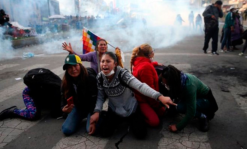 Dans le cas de Santa Cruz, ils organisent des hordes motorisées sur des 4×4 avec des bâtons à la main pour effrayer les Indiens qu’ils appellent «collas», qui vivent dans les quartiers périphériques et les marchés. Ils chantent des slogans qui clament «tu dois tuer des collas» et si une femme en pollera (jupe bouffante) les croise sur la route, ils la battent, la menacent et lui donnent l’ordre de quitter leur territoire. À Cochabamba, ils organisent des convois pour imposer leur suprématie raciale dans la zone sud, où vivent les classes nécessiteuses, et ils chargent – comme s’il s’agissait d’un détachement de cavalerie – des milliers de paysannes sans défense qui marchent pour la paix. Ils portent des battes de baseball, des chaînes, des grenades à gaz. Certains montrent des armes à feu. La femme est leur victime préférée. Ils attrapent une maire d’un village paysan, l’humilient, la traînent dans la rue, la ruent de coups, lui pissent dessus quand elle tombe à terre, lui coupent les cheveux, la menacent de la lyncher, et quand ils réalisent qu’ils sont filmés, ils décident de la peindre le rouge symbolisant ce qu’ils vont faire de son sang.