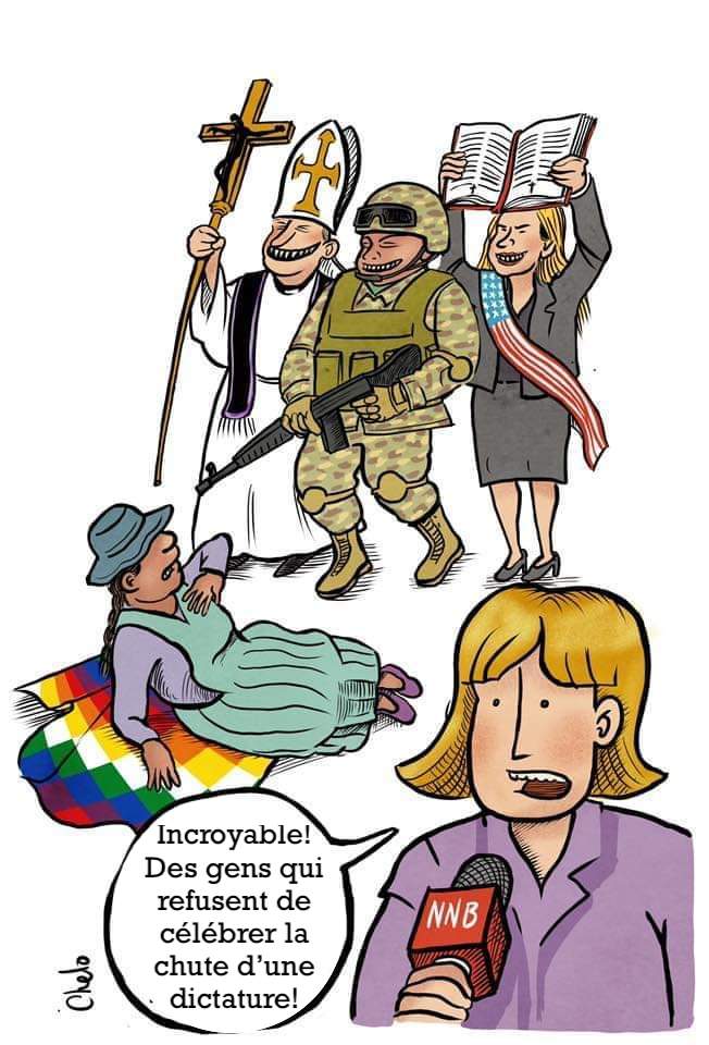 Les médias boliviens à propos des répressions brutales disent honteusement qu’il s’agit de « confrontations armées », mais aucun média ne demande pourquoi il n’y a pas de police ou de forces armées déchues à Senkata ou à El Alto, car si elles étaient armées avec autre chose que des armes létales, la chose logique est que les pertes seraient des deux côtés, ceux qui constituent les marches contre le gouvernement putschiste, sont des gens qui n’ont PAS d’armes, qui n’ont PAS d’entraînement militaire et qui se réclament contre l’auto-proclamation d’Añez. Il faut rappeler que ni Añez ne figurait au scrutin, ni Camacho.