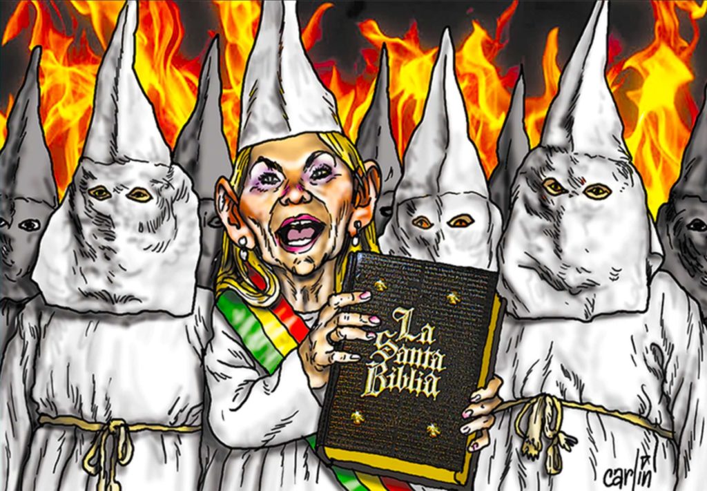 L’hypocrisie et la méchanceté se manifestent dans toutes les déclarations des ministres, dans l’utilisation du mot « sédition » qui aujourd’hui est synonyme de « partisan du MAS » qui serait le diable, la méchanceté. La lecture religieuse qui a couvert le langage fasciste pervers n’a pas pu rester cachée et se manifeste toute crue quand on fait des listes de « coupables, » quand on arrête des gens en toute illégalité et que la présomption d’innocence a été jetée aux ordures. L’hypocrisie se manifeste quand is déclarent tous les jours que leur unique mission est d’organiser des élections alors qu’ils démantèlent le modèle économique en utilisant des artifices de langage pour démontrer que la gestion de l’économie « pendant 13 ans » a été désastreuse, quand toutes les instances internationales y compris la Banque Mondiale ont accepté la bonne gestion et la croissance économique mises en place par Evo Morales.