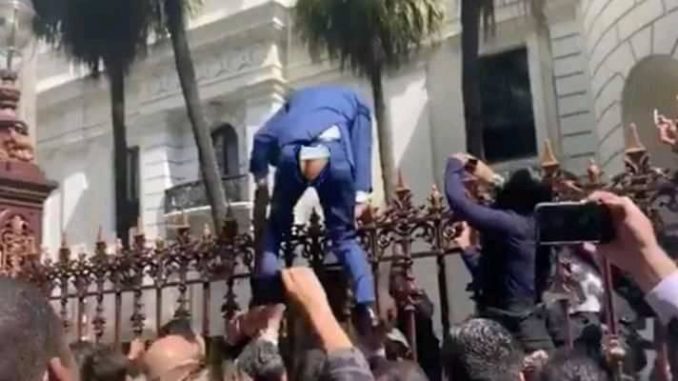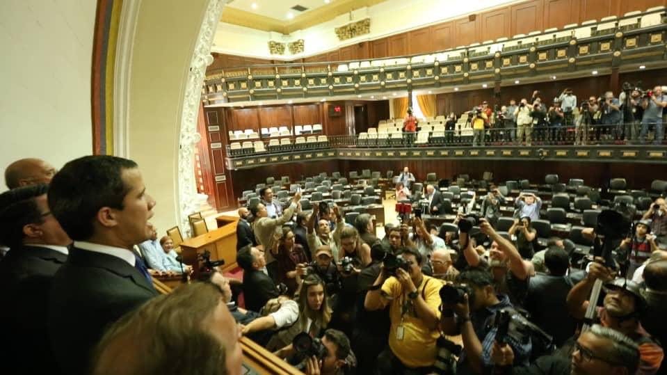 Malgré que le quorum était atteint et malgré la présence de députés de toutes les forces politiques, le Président de l’Assemblée, Juan Guaidó, a refusé d’entrer dans le Palais législatif et d’ouvrir la session, comme il était tenu de le faire. Il est resté à l’extérieur du siège du parlement en essayant de forcer l’entrée de quatre députés qui, pour différentes raisons, avaient été disqualifiés par la Cour suprême de justice. Sur les enregistrements, on peut l’entendre dire que « s’ils n’entrent pas, je n’entre pas non plus ». Eux sont finalement entrés, mais lui est resté dehors. Il faut noter qu’aucun d’entre eux n’a participé aux sessions de la législature en cours et que Guaidó, en tant que président de l’assemblée, n’a à aucun moment exigé leur présence.