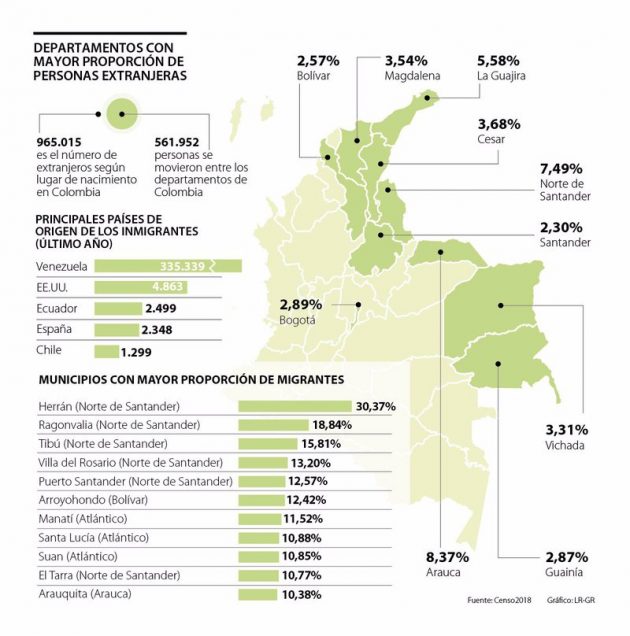 Alors que Norte de Santander est le département qui compte la deuxième plus grande population de migrants, avec 7,5 %, Cesar est à la quatrième place avec 3,7 %, et Santander à la dixième place avec une population de migrants de 2,3 %.