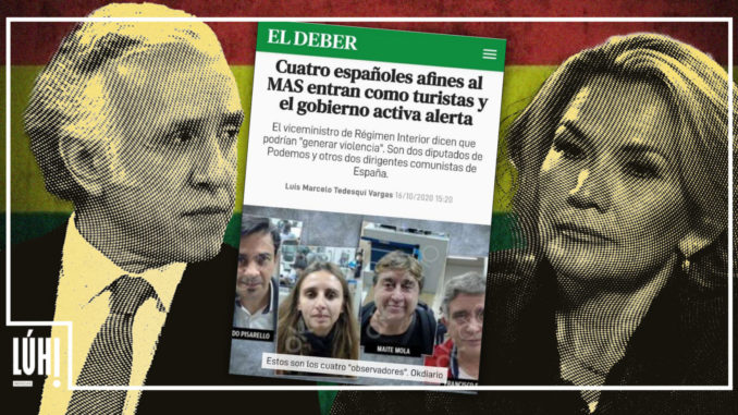 Le gouvernement putschiste bolivien harcèle les observateurs internationaux qui sont arrivés ou tentent d’entrer dans le pays pour les élections de ce dimanche. Plusieurs délégations l’ont dénoncé, dont celle des Espagnols Gerardo Pisarello et Lucía Muñoz Dalda — de Podemos — et Fran Pérez Esteban et Maite Mola — d’Izquierda Unida. L’homme d’affaires et ministre du gouvernement de facto de Bolivie, Arturo Murillo, a même déclaré sur son profil Twitter que « nos élections seront une fête démocratique, plus il y aura d’observateurs, mieux ce sera pour tout le monde. Nous avertissons que les agitateurs et les personnes qui cherchent à provoquer des violences ne sont pas les bienvenus. On les met dans un avion ou derrière les barreaux. Conduisez-vous bien, nous savons qui vous êtes et où vous êtes ».
