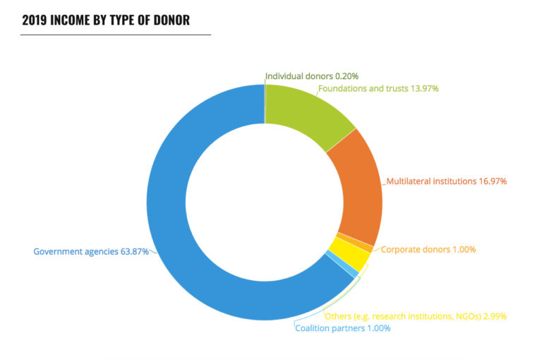 L’organisation coupole Transparency International, dont le siège est à Berlin et dont le revenu d’exploitation s’élève à 25,7 millions de livres sterling, est financée par les gouvernements nord-américain et britannique, entre autres, depuis sa création en 1993. En 2019, le DFID était le plus grand donateur gouvernemental, avec 4,4 millions d’euros, soit près du double du deuxième plus grand bailleur de fonds gouvernemental, le ministère des affaires étrangères du Canada. Le Département d’État américain a donné 743 799 euros.
