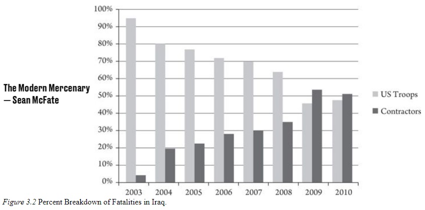 Il n’est pas étrange que l’espion effectue des missions en Irak en tant que contractuel et non en tant que soldat officiel, compte tenu du fait que, depuis l’invasion américaine de ce pays en 2003, le nombre d’entrepreneurs tués sur le champ de bataille a augmenté pendant les années de guerre. En fait, McFate explique dans son livre : « En 2010, plus d’entrepreneurs ont été tués que de personnel militaire, marquant la première fois dans l’histoire que les pertes des entreprises ont dépassé les pertes militaires sur les champs de bataille américains. »