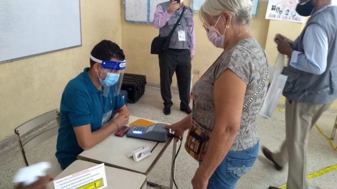 J’ai été témoin lorsqu’une personne a commis une erreur dans le bureau de vote et que la machine a rejeté son inscription, puis a été dirigée par le personnel vers le bureau de vote où elle devait voter. Une fois les données saisies et l’enregistreur confirmant les données, l’électeur place son doigt sur l’appareil et son empreinte digitale est lue, comme une double mesure d’identification. Tous les citoyens vénézuéliens sont identifiés par empreinte digitale lorsqu’ils fabriquent leur carte d’identité.