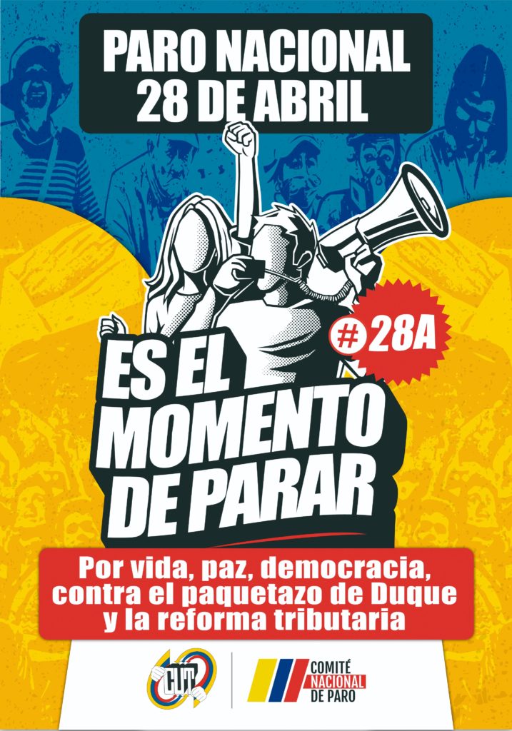 Le Président a présenté au Congrès un projet de réforme fiscale dont les deux axes centraux sont l’augmentation de la TVA et l’élargissement de la base d’imposition sur les salaires. La mesure a suscité le rejet des organisations syndicales, des organisations sociales, des étudiants. « Pour la vie, la paix, la démocratie. Contre le ‘paquetazo’ et la réorme fiscale de Duque », dit l’appel à la grève du « 28A ».