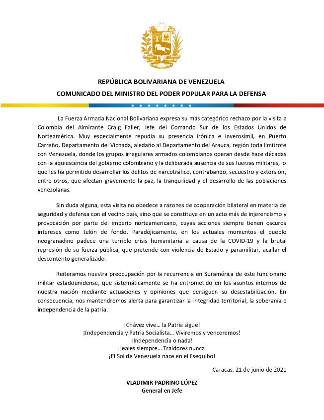 Nous réitérons notre préoccupation quant à la récurrence en Amérique du Sud de ce responsable militaire américain, qui s’est systématiquement immiscé dans les affaires intérieures de notre nation par des actions et des positions visant à la déstabiliser. Par conséquent, nous resterons vigilants afin de garantir l’intégrité territoriale, la souveraineté et l’indépendance de la patrie.