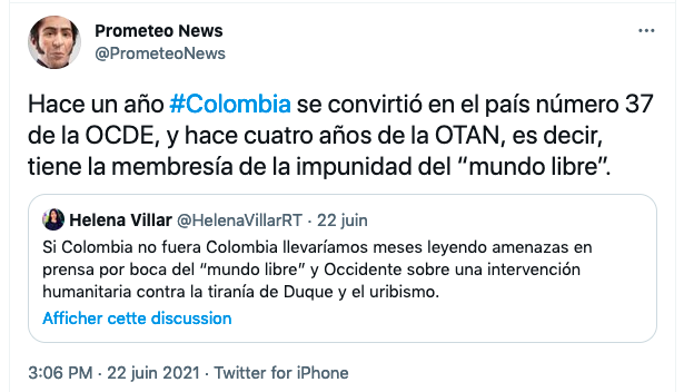 Si la Colombie n’était pas la Colombie, nous lirions depuis des mois dans la presse les menaces du « monde libre » et de l’Occident concernant une intervention humanitaire contre la tyrannie de Duque et de l’Uribisme.